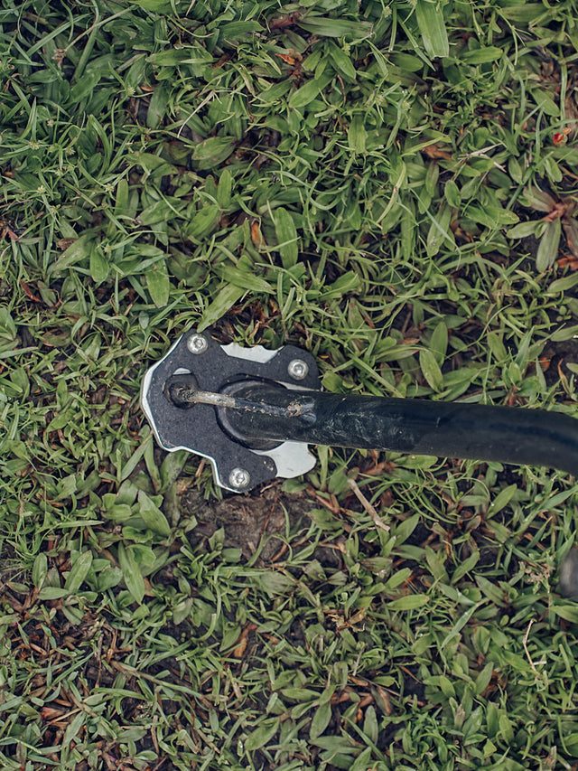 Enhance the stability of your KTM Adventure 390 X (2025 model) with the Legundary Aluminium and Mild Steel Side Stand Base in a striking silver and black combination, available at Bandidos pitstop. This dual-material design features a durable mild steel lower plate for strong ground contact and a lightweight aluminium upper plate for improved corrosion resistance and aesthetics. The widened base increases the surface area of the side stand, preventing the bike from sinking into soft surfaces like sand or mud, making it an essential upgrade for touring and off-road riders. Precision-engineered for a perfect fit, this side stand base ensures reliable performance and adds a rugged yet refined touch to your KTM Adv 390 X 2025