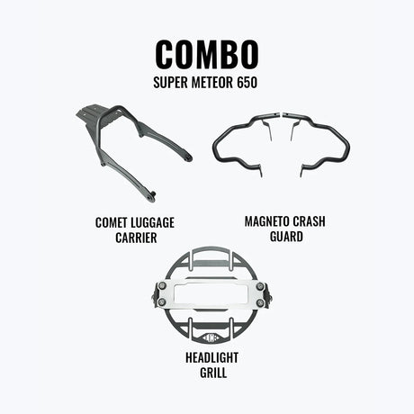 Legundary Super Meteor 650 Combo Cosmic Headlight Grill, Magneto Crash Guard & Comet Luggage Carrier