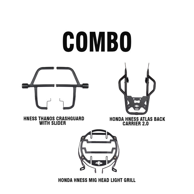 Upgrade your Honda Hness / CB350 RS into a fully equipped touring machine with this premium combo from Bandidos Pitstop, combining protection, utility, and rugged styling. The Legundary Thanos Crash Guard offers heavy-duty protection with integrated sliders that safeguard the engine and critical components during impacts, while also enhancing the bike’s aggressive road presence . Complementing this is the Atlas Back Carrier 2.0, designed for secure luggage mounting and improved load distribution, making it ideal for long rides and daily practicality. Completing the setup is the MIG Headlight Grill, which protects the headlamp from debris and impacts while adding a bold, adventure-ready look. Together, this combo transforms your motorcycle into a safer, more functional, and visually striking machine—perfect for touring enthusiasts and everyday riders alike.