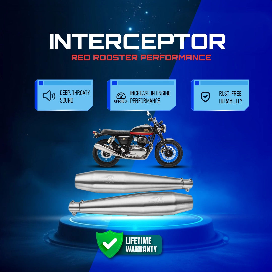 The Red Rooster Performance Red Rooster Exhaust is designed for the RE Interceptor Stellar. Available at Bandidos pitstop. Its matte finish ensures an innovative look and maximum performance. Get the most out of your machine with this industry-leading exhaust system.