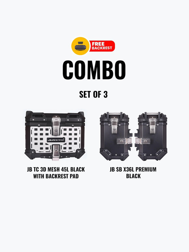 Experience the perfect blend of premium storage and sleek design with the Set of 3 Combo featuring the JB Racing Top Case 3D Mesh 45L Premium in Black With Backrest Pad and JB Racing Side Box X36L Premium in Black from Bandidos Pitstop. This combo is meticulously crafted to offer both functionality and style, providing riders with an upgraded storage solution that enhances the overall aesthetics of their motorcycles. Elevate your storage capacity and ride in style.