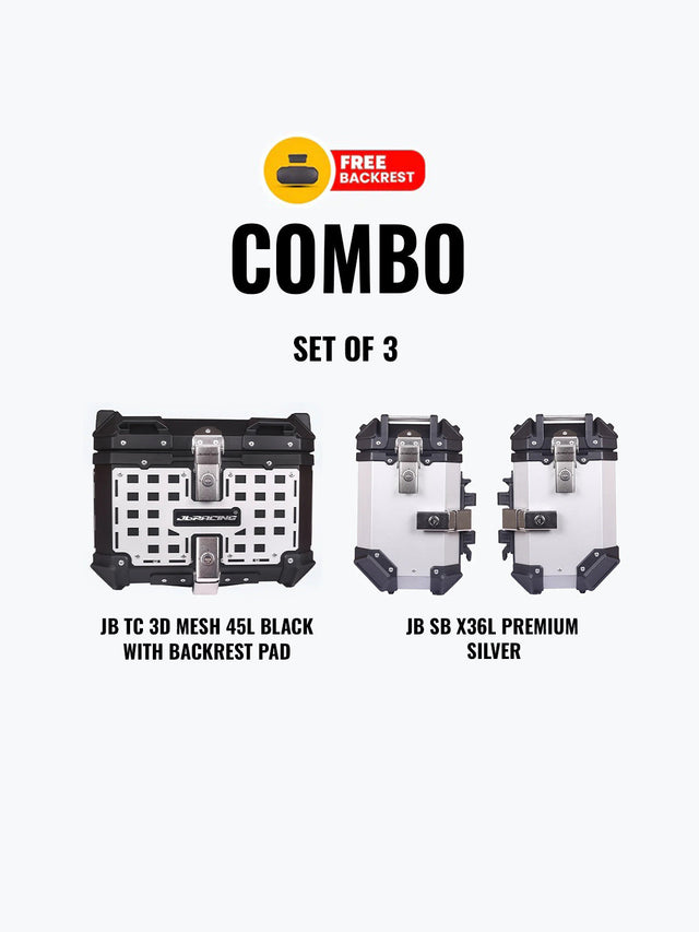 Experience the perfect blend of premium storage and sleek design with the Set of 3 Combo featuring the JB Racing Top Case 3D Mesh 45L Premium in Black With Backrest Pad and JB Racing Side Box X36L Premium in Silver from Bandidos Pitstop. This combo is meticulously crafted to offer both functionality and style, providing riders with an upgraded storage solution that enhances the overall aesthetics of their motorcycles. Elevate your storage capacity and ride in style.