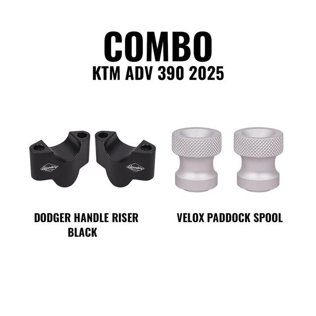 The Legundary Handle Riser and Paddock Spool Combo is a smart and stylish upgrade package designed especially for the 2025 KTM Adventure 390, blending enhanced ergonomics with practical workshop-ready utility. Available at bandidos pitstop. The black aluminium handle riser elevates your handlebars to deliver a more comfortable, upright riding posture reducing wrist fatigue and improving control on long rides, touring routes, and rough trails. Complementing this is a set of silver aluminium paddock spools, precision-machined for secure fitment to the Adventure 390 rear swingarm, providing reliable lift points for paddock stands that make chain maintenance, tyre changes, and cleaning far easier. Both components are crafted from lightweight, corrosion-resistant aluminium alloys and finished in eye-catching black and silver, bringing durable performance and a cohesive, premium look that enhances your bike rugged adventure styling. Whether you’re fine-tuning your ergonomics for comfort or preparing your bike for maintenance and storage, this combo adds rider-centric comfort and functional convenience in one well-matched upgrade package.