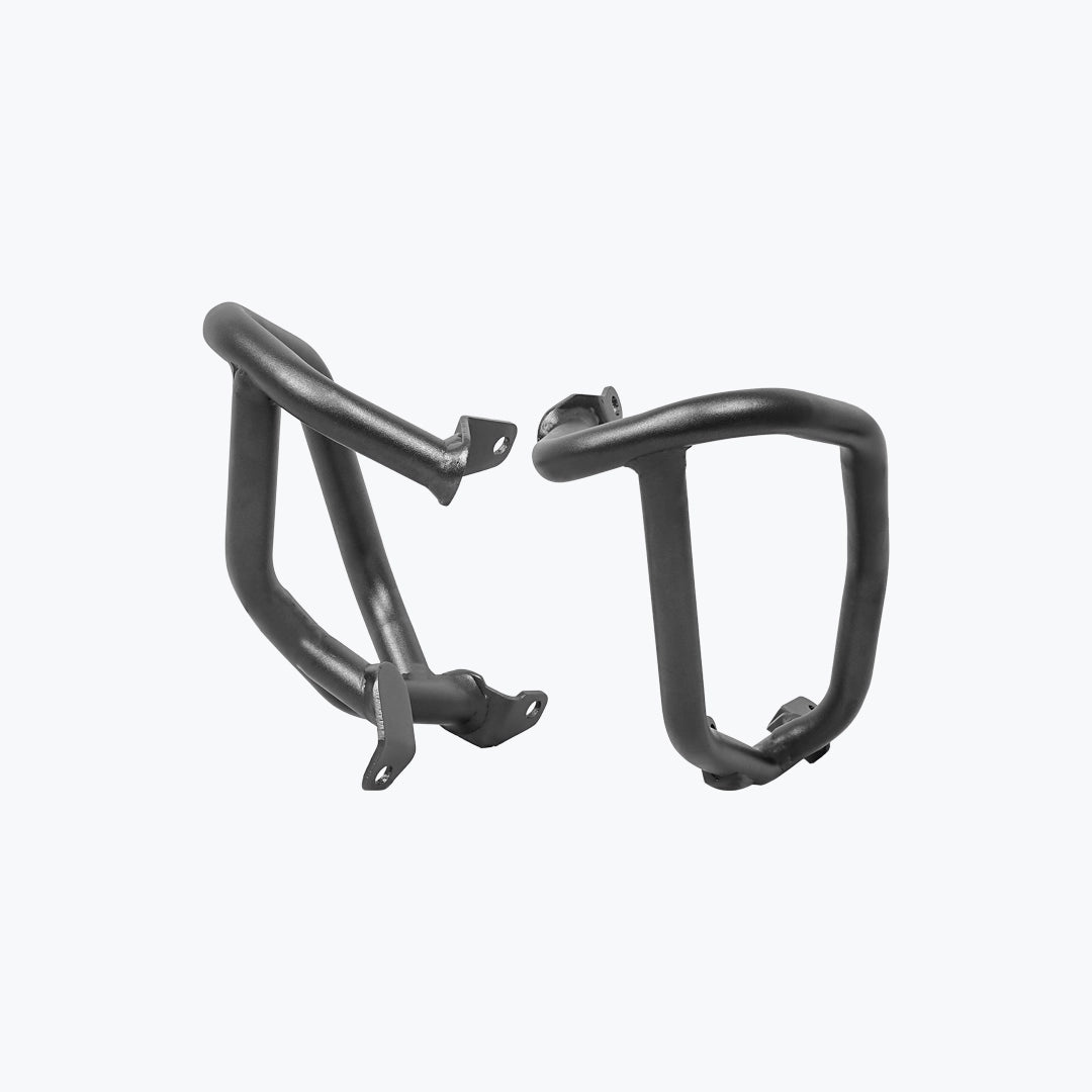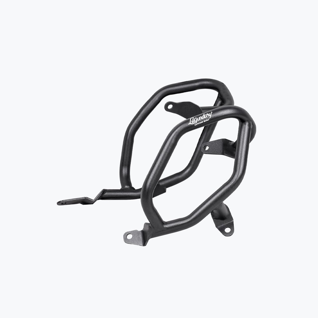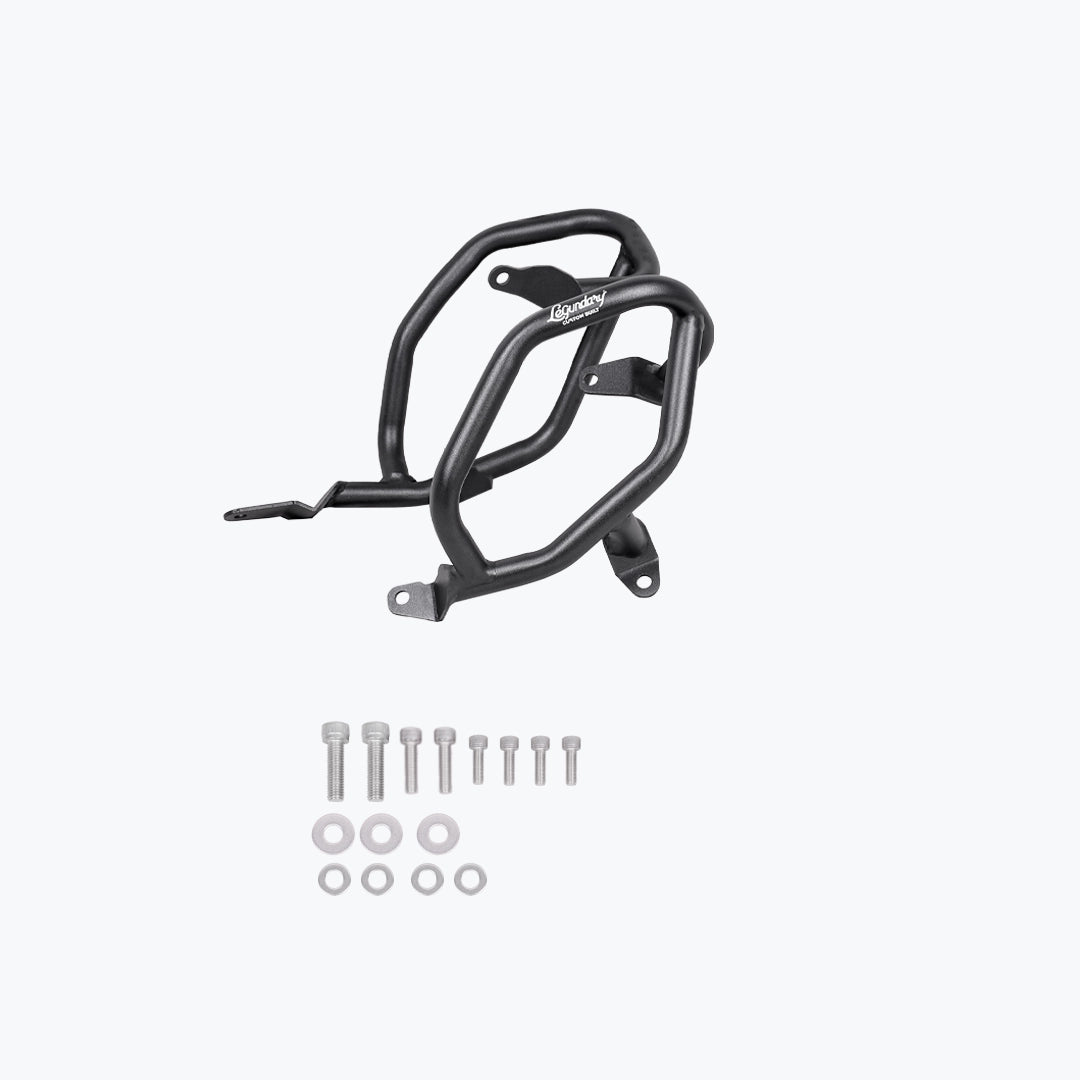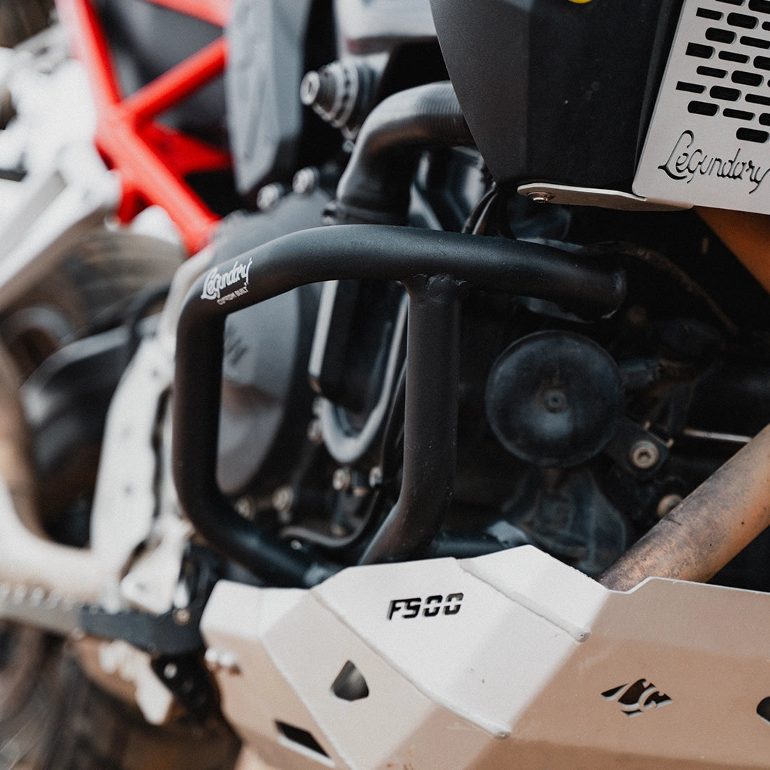 The Legundary Bellator Crash Guards in black mild steel are robust, purpose-built protective accessories designed to safeguard your BMW F 900 GS during everyday rides and adventurous excursions alike. Available at bandidos pitstop. Constructed from high-strength mild steel with a rugged black powder-coated finish, these crash guards form a strong barrier around the engine, frame, and vulnerable bodywork to help absorb and deflect impact forces in the event of a tip-over or low-speed fall. Their precision-engineered tubular design seamlessly complements the F 900 GS aggressive adventure styling while maintaining ground clearance and handling characteristics. The Bellator guards provide both functional protection and visual confidence giving riders peace of mind on city streets, highways, and challenging off-road terrain. Whether you’re commuting daily or tackling multi-day tours, these crash guards help minimize repair costs and enhance rider confidence with durable, dependable coverage.