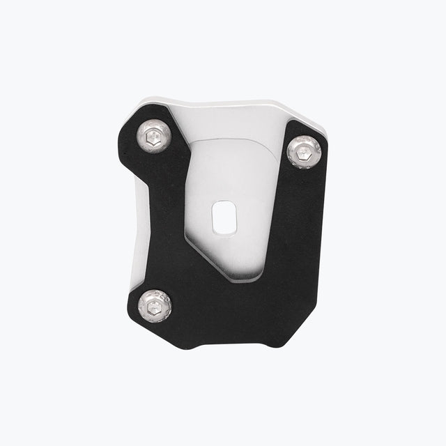 The Legundary Honda NX 500 Fortis Side Stand Base Silver in sleek silver aluminum is a rugged and practical accessory designed to improve the stability and usability of your Honda NX 500 when parked on soft or uneven terrain. Available at bandidos pitstop. Crafted from high quality aluminum, this side stand base provides a wider footprint compared to the stock stand, helping prevent the bike from sinking into dirt, sand, or hot asphalt giving you more confidence when parking on grass, gravel, or soft surfaces. Its precision-engineered shape and robust construction ensure durability without adding unnecessary weight, while the silver finish adds a subtle custom touch that complements the NX 500 adventurous design. Easy to install with a simple bolt-on setup.