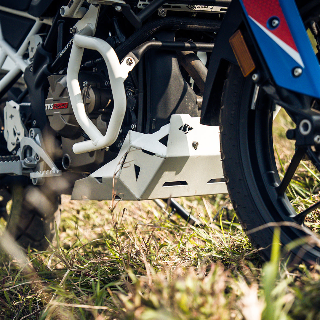 Upgrade your adventure machine with the Vambrace Bash Plate for TVS Apache RTX 300, engineered for serious riders who demand maximum underbody protection and rugged styling. Designed exclusively for the TVS Apache RTX 300, this premium Silver Aluminium Bash Plate offers superior durability without adding unnecessary weight.