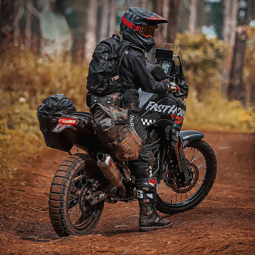 Built for riders who want compact yet capable side luggage without the need for a dedicated rack, this pair-set of saddle bags offers dual 18-litre capacity (one each side) in a rugged, rack-less format. Available at Bandidos pitstop. Crafted from 500D PVC tarpaulin material, the bags provide 100% waterproof protection with a roll-up closure system to keep contents dry and secure under rain or spray. The “soft” design allows for easy mounting and adjustment via Velcro boards and buckles, letting you space the bags to suit different rear seats or passenger setups, and then collapse or stow them when not in use. Ideal for daily use, commuting, or adventure rides where you need reliable side-luggage but don’t have or want a full pannier rack, these bags combine impressive water resistance, practical side-storage capacity and flexible mounting for a wide variety of motorcycles.
