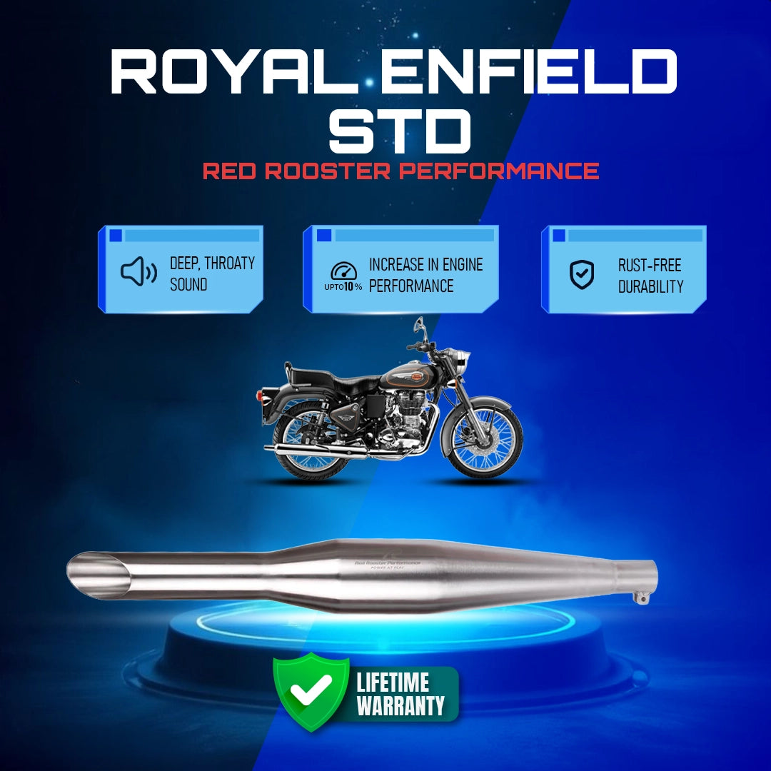 The Red Rooster Performance Matte Finish Classic STD Electra is a timeless piece of engineering. Featuring a matte silver finish and an exhaust, this motorcycle is designed for performance and speed. Enjoy the modern look and superior quality of this classic model.