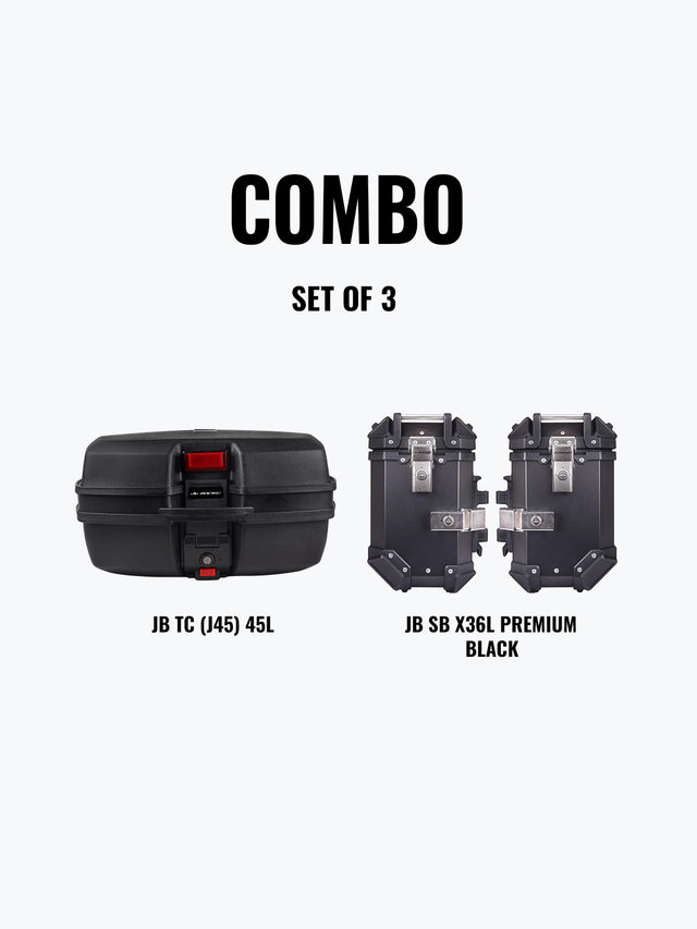 Experience the perfect blend of premium storage and sleek design with the Set of 3 Combo featuring the JB Racing Top Case (J45) 45L in Black and JB Racing Side Box X36L Premium in Black from Bandidos Pitstop. This combo is meticulously crafted to offer both functionality and style, providing riders with an upgraded storage solution that enhances the overall aesthetics of their motorcycles. Elevate your storage capacity and ride in style.