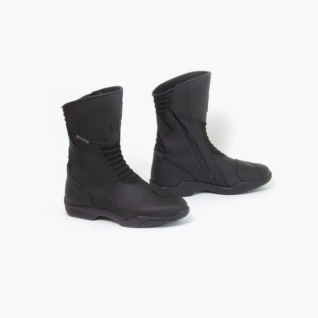 The FORMA Arbo Boots Black featured at Bandidos pitstop are crafted as a versatile touring solution that combines waterproof performance, rider safety, and everyday comfort. Made with a durable blend of synthetic materials and Cordura®, they feature a breathable Drytex® tubular lining to keep feet dry in rain or puddles. These boots are designed for protection with integrated TPU shin and ankle guards, plus reinforced gear-shift panels, and an anti-crush, double-density rubber sole with anti-shock EVA and felt midsoles for impact damping. A handy zip-and-Velcro closure system ensures a secure fit, while reflective rear panels improve visibility in low light. Inside, you'll find soft memory foam padding, antibacterial removable foot beds featuring an Air Pump System (APS), and a supportive, touring-ready sole structure all adding up to excellent comfort on longer rides