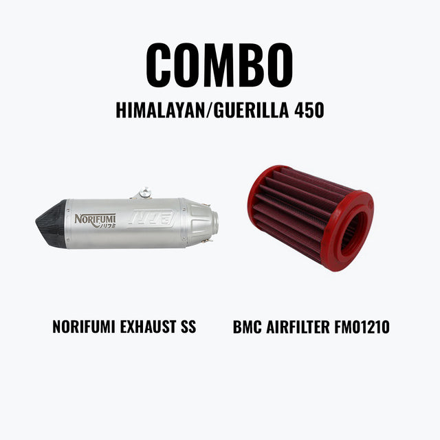 Elevate your NORIFUMI Slipon Whoops SS Carbon Himalayan 450 Long + BMC Air Filter FM01210 upgrade from Bandidos pitstop. The Norifumi Slip On Whoops SS Carbon Long exhaust delivers a high grade stainless steel construction wrapped in a carbon-finished sleeve, engineered for durability, reduced weight, and a refined sporty stance. Its tuned design optimises exhaust flow, giving your engine crisper throttle response and a richer, more commanding note. Paired with the BMC Air Filter FM01210 which features advanced cotton-gauze media, full-moulded housing and reusable design this combo ensures cleaner, higher-volume intake airflow to match the enhanced exhaust output. The result improved engine breathing in and out for better mid-range punch, sound that stands out, and a refined upgrade that fits your bike without cutting or major mods. Whether you’re hitting the road or exploring trails, this combo offers both style and function in one powerhouse package.