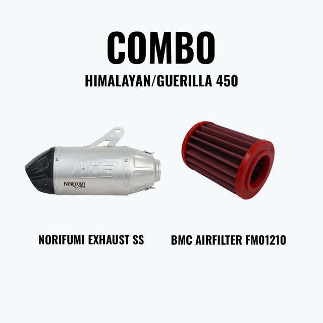 Elevate your NORIFUMI Slipon Whoops SS Carbon Himalayan 450 Short + BMC Air Filter FM01210 upgrade from Bandidos pitstop. The Norifumi Slip On Whoops SS Carbon Short exhaust delivers a high grade stainless steel construction wrapped in a carbon-finished sleeve, engineered for durability, reduced weight, and a refined sporty stance. Its tuned design optimises exhaust flow, giving your engine crisper throttle response and a richer, more commanding note. Paired with the BMC Air Filter FM01210 which features advanced cotton-gauze media, full-moulded housing and reusable design this combo ensures cleaner, higher-volume intake airflow to match the enhanced exhaust output. The result improved engine breathing in and out for better mid-range punch, sound that stands out, and a refined upgrade that fits your bike without cutting or major mods. Whether you’re hitting the road or exploring trails, this combo offers both style and function in one powerhouse package.